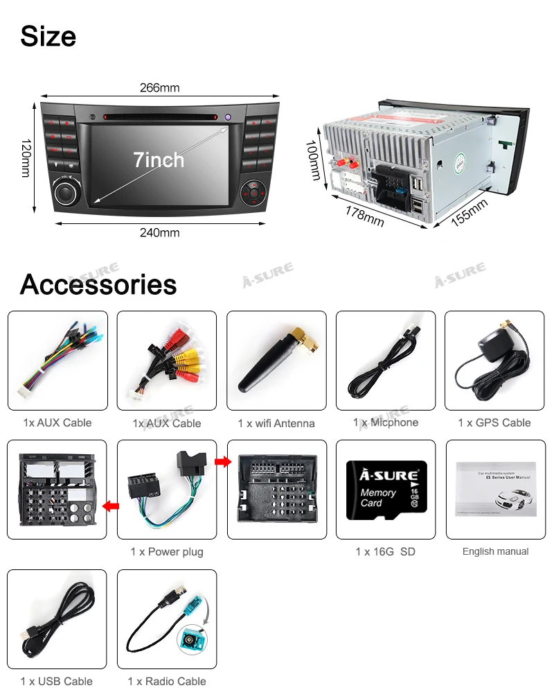 The Auto Multimedia System Fits for: Mercedes Benz E-Class Mercedes BenCLS Class Mercedes BenzG-Class Notice: *The radio is full-touch screen, remote control is not needed, which is not included in this item. *BeforePurchase,dopleasecarefullycheckthedimensionssoastoavoidinconvenience. *If yours is fiber optic plug, you need to buy extra5Mextension kit for extra GBP35. Please note that shipping from China will charge Custom Tax. Any question, please do not hesitate to contatc us. Why Shop With A-Sure? A-SURE aims to bring the most exciting products to your door. Are you looking for new products and technologies that canfacilitateyour life, as well as with a very good price/performance ratio? All these are what we A-SURE do and concern for you. Actuallywerepresent amanufacturer who produces some of the most competitive products on market, will carry a vast selection of value-priced novelties. And allgoods can be brought to your door at reasonable prices. Your order will be QC checked for minimum 3 times prior to delivery to you. Think of A-SURE as most efficient and reliable cross-border shoppinghelper around. We have over 8years worth of experience in In-Car entertainment. Professional and Fast service, Constant Innovation help us to be the one you can count on. You can get the below unique service and features from our commodities: All our items are tested to ensure working properly before shipping. All our items come with a 24-month Manufacture Warranty.The warranty will not cover damage from improper installation, accident, misuse,abuse, improper wiring, and incorrect voltage operating the unit against the instructions in the owner's manual. You may cancel your order within 30 days If the article is found to be defective upon receipt - by returning the article for refund. The time limit begins after receipt of this notification in writing, but not before receiving the goods to consignee. Buyer must pay the postage cost for sending the item back to us under any circumstances. Please inform us of the reason of your order revocation and send us a clear picture or a video as a proof. Items returned to us without a report will not be processed. We highly recommend that all items are installed by professionals. We will not be responsible for items that have been damaged during installation by non-professionals.Please read all ourterms stated in our listing before purchase Note: Installation Fees are out of our control, they must be paid by Buyer. Installation fees are not included in this transaction, they will not be refunded/covered by us or eBay at any circumstances.